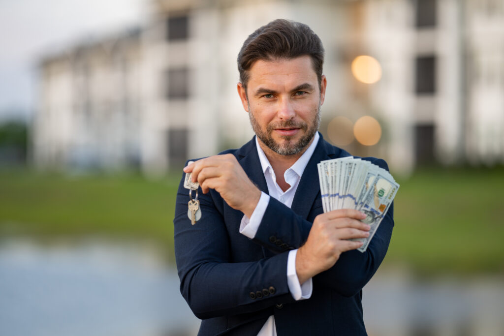 House owner, real estate agents hold money dollars and house keys. Housing estates, buying and selling housing estates. Man celebrating new purchase buying real estate. Mortgage concept