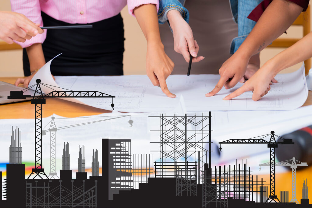Business team working together in the office. They have discussion on the subject of various technical matters concerning their project and Line of silhouettes of construction site with cranes.
